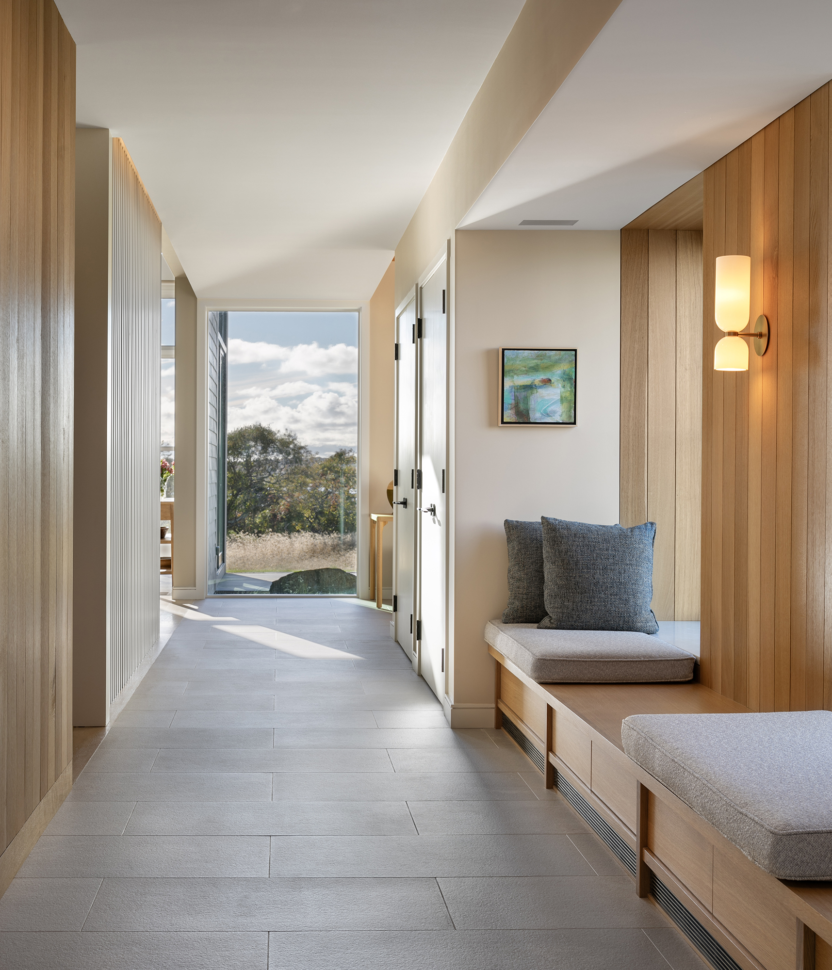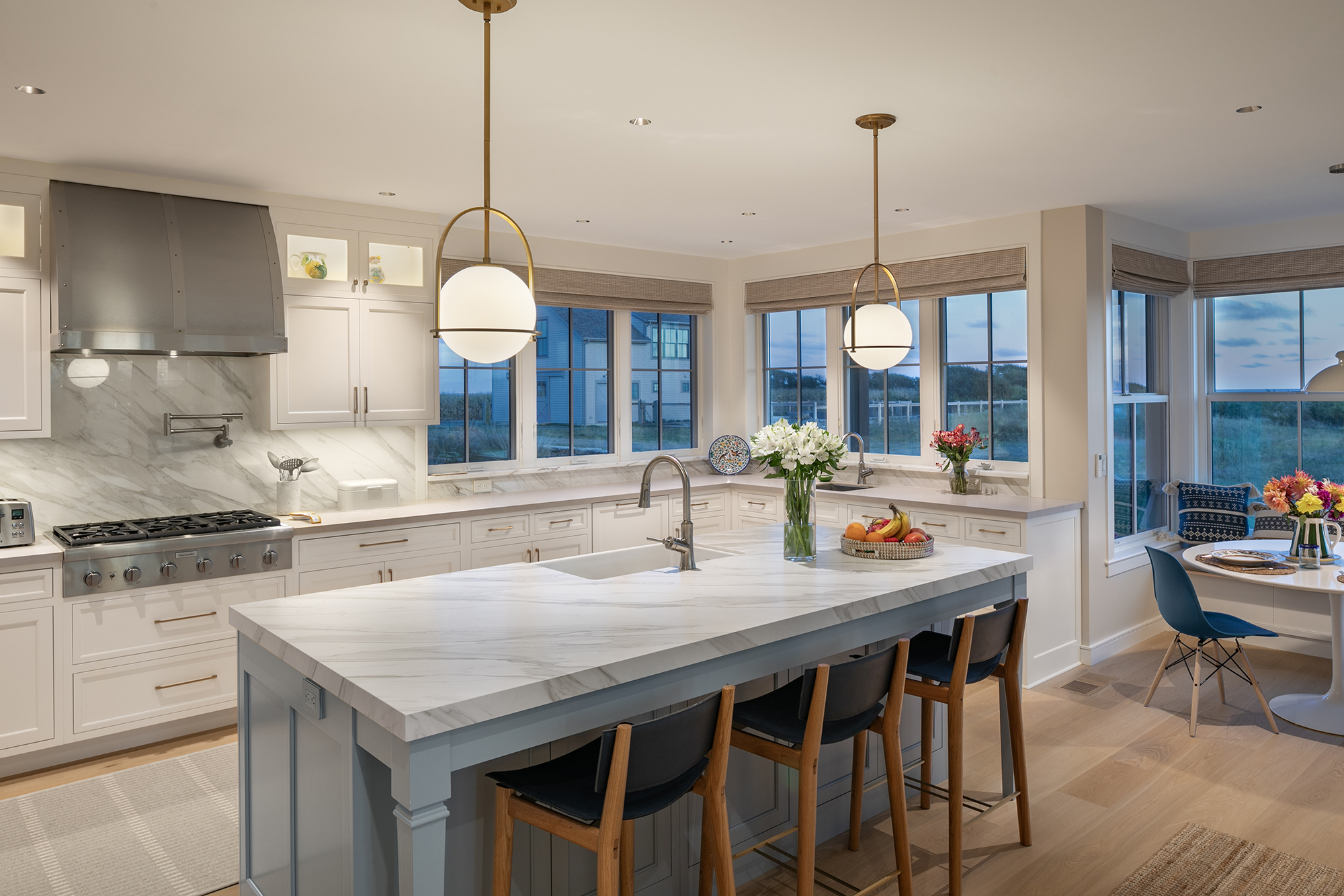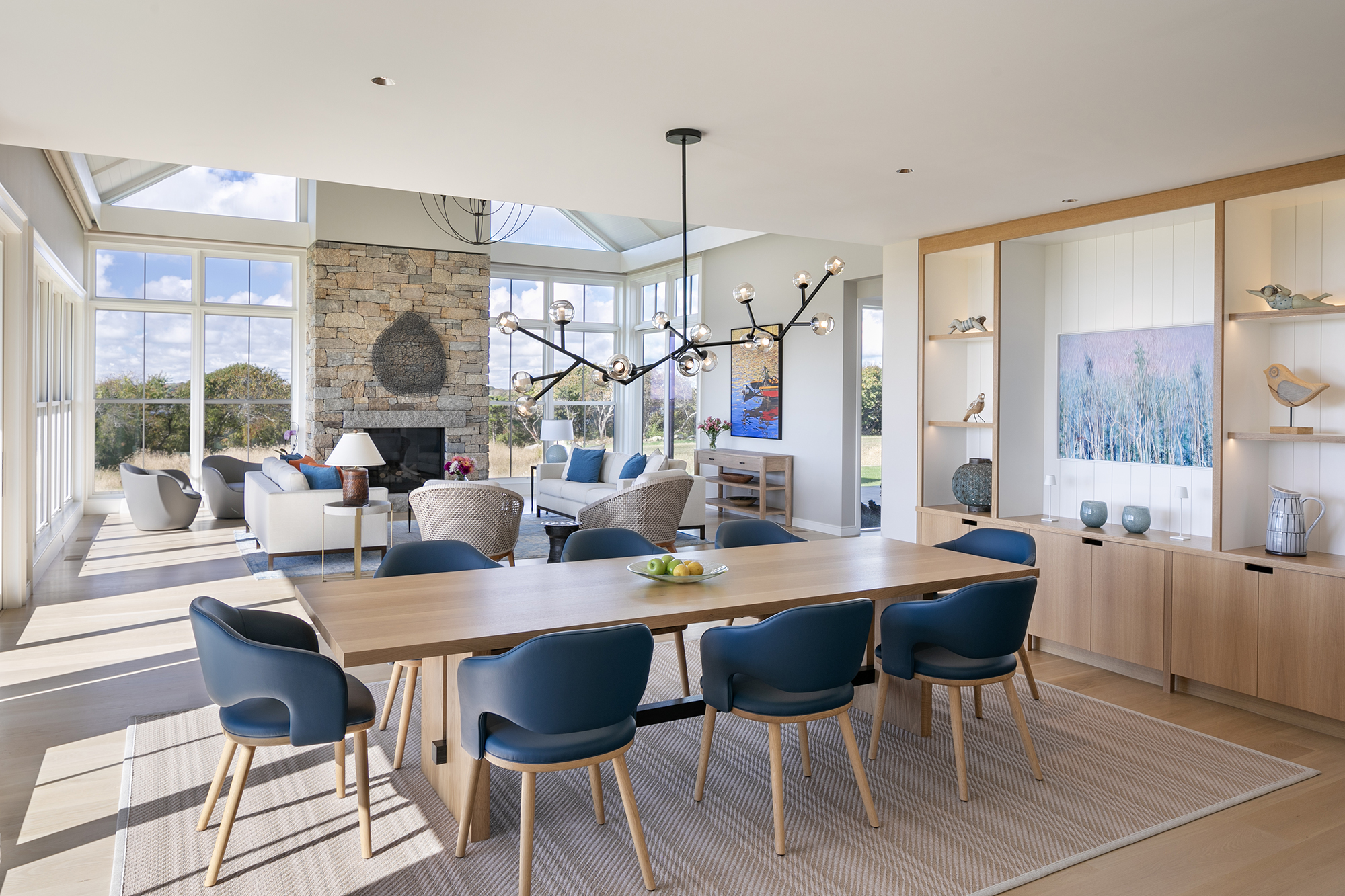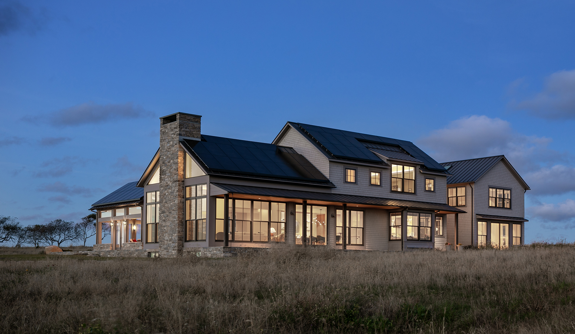 We provided interior and exterior lighting design for this stunning summer residence, set on a historic 50-acre waterfront farm. The architectural lighting was thoughtfully integrated to enhance and articulate the home’s form, materials, and detailing. Concealed coves, grazers, step lights, and cabinet lighting were precisely coordinated within the millwork and architectural elements, allowing the light to feel seamless and intentional rather than applied. A layered lighting approach supports the home’s natural transition from day to evening, balancing warm, ambient illumination for living spaces with focused task lighting for work-from-home environments. Close collaboration with the landscape architect extended the lighting experience outdoors, creating a quietly magical atmosphere across the property during the evening hours.